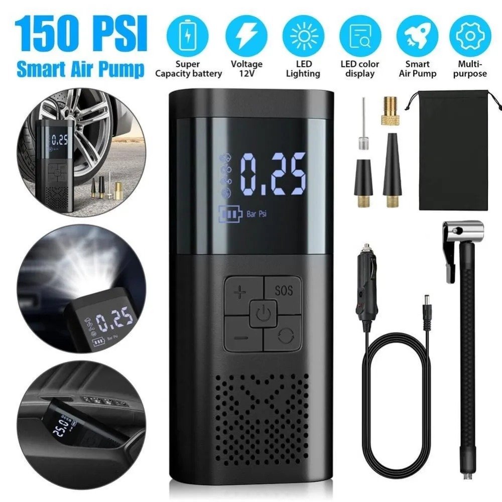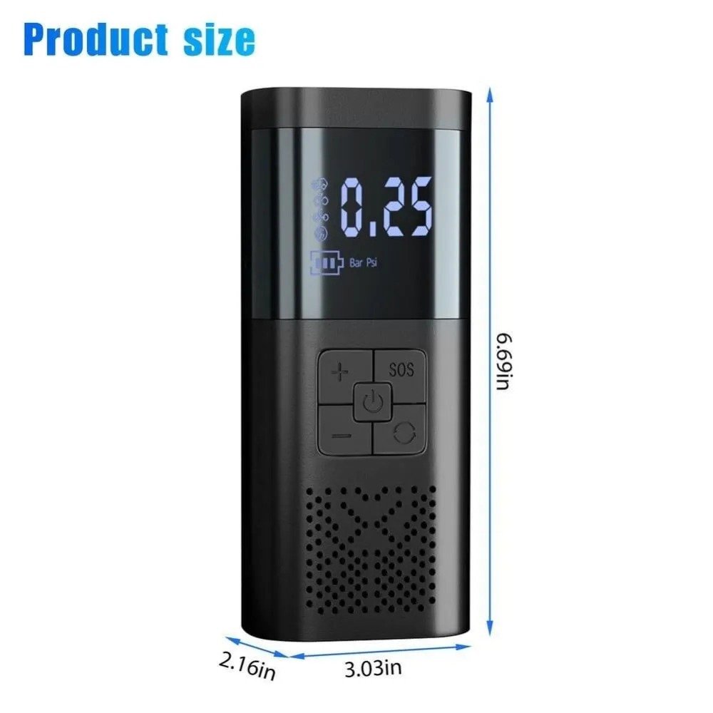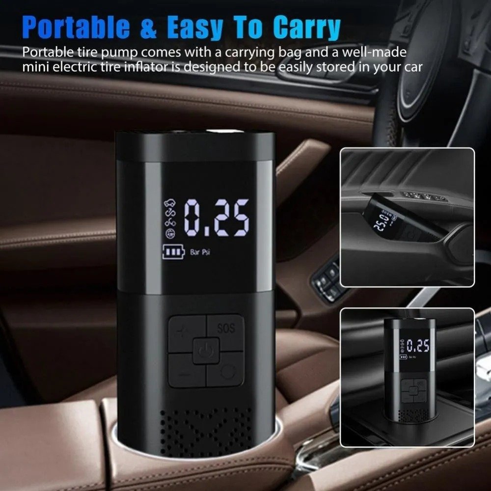 منفاخ اطارات لاسلكي كهربائي محمول يوفر تعبئة سريعة ودقيقة للإطارات مع شاشة رقمية وإضاءة LED مدمجة لسهولة الاستخدام في أي وقت ومكان.